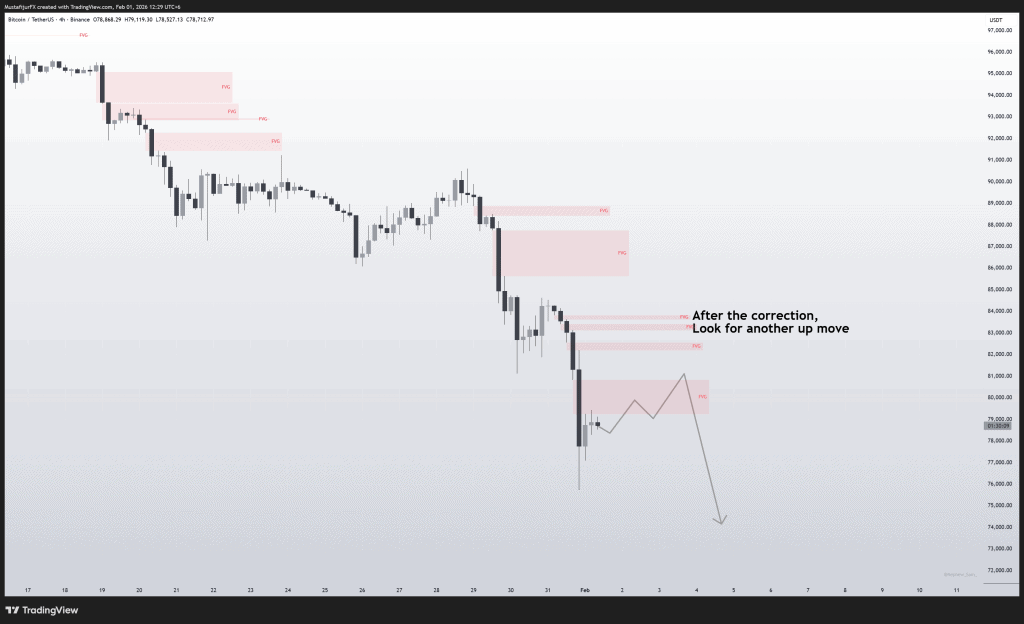 - Liquidity Hunt: The recent breakdown has moved price through key support levels. Smart Money is likely targeting the $70,000 zone as the next major pool of “Sell-Side Liquidity”.