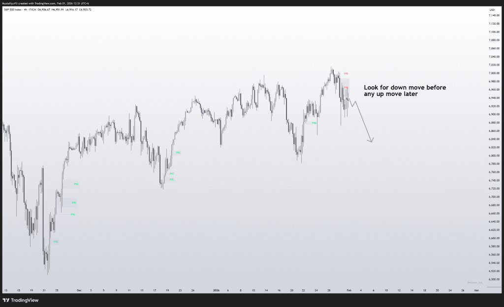 - SMC View: The S&P 500 is showing a “broadening leadership,” moving away from extreme concentration in a few tech giants. Watch the Fair Value Gaps (FVG) left by the recent Nasdaq-led surge.