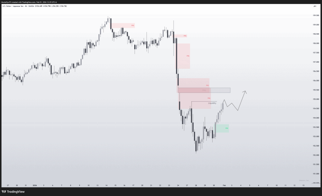 - SMC View: We are currently in a high-alert Liquidity Grab phase. Markets are spooked by coordinated “rate checks” and potential intervention rumors involving both the BoJ and US Treasury. Price is currently hovering near 153.30, which many institutions view as “oversold”.