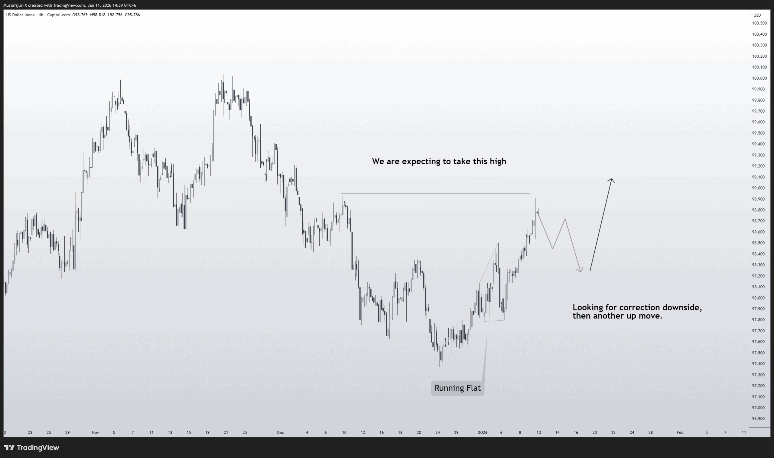 The Dollar Index is providing the roadmap for the entire Forex market this week. Structurally, we have identified a clean Running Flat correction. In Wave Analysis, this is a powerful continuation pattern that suggests strong underlying momentum—buyers are stepping in early, preventing price from correcting deeply.