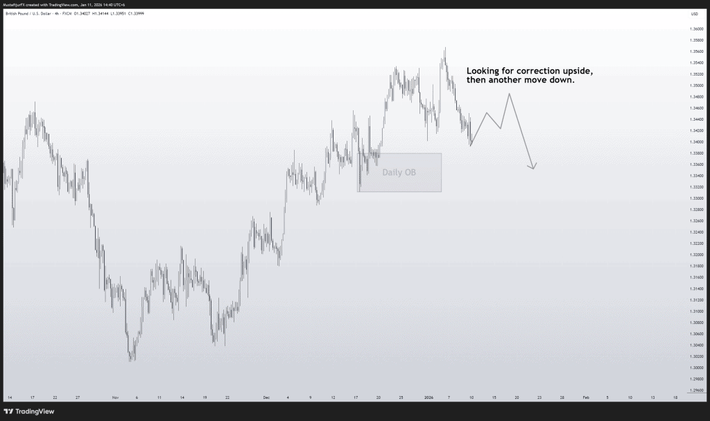 Cable is presenting a very similar structure to the Euro but with a specific area of interest. We have identified a Daily Order Block (OB) that has caused a reaction, but the bearish pressure remains dominant.
